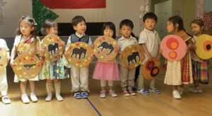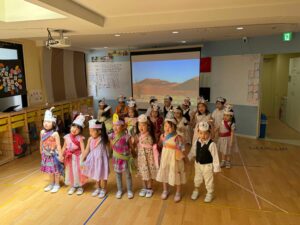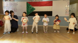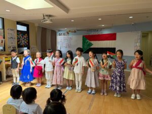 5歳の子どもたちは、スーダン大使館を訪問した経験を生かし、スーダンの国歌を歌ったり、国のシンボルや食文化についてプレゼンテーションを行いました。堂々と発表する姿は、下のクラスの子どもたちに良い刺激を与えられ、憧れの存在となり、子どもたちの大きな成長を感じられる瞬間でした。