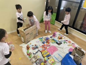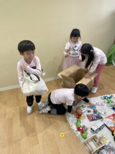 在園児の保護者様に協力をしていただき、「お家にある使えそうなもの」をそれぞれ持ち寄って、Orca2&3クラス(4・5歳児)の園児が中心となり、進めてまいりました。