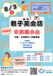 内容:親子で英会話。インターナショナルスクールの先生と英会話レッスンをしてみましょう!普段の会話を英語に変えてみよう!
