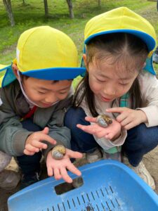 As they walked through nature, they made many discoveries using all five senses. A particularly memorable scene was how they collected fallen leaves for composting.