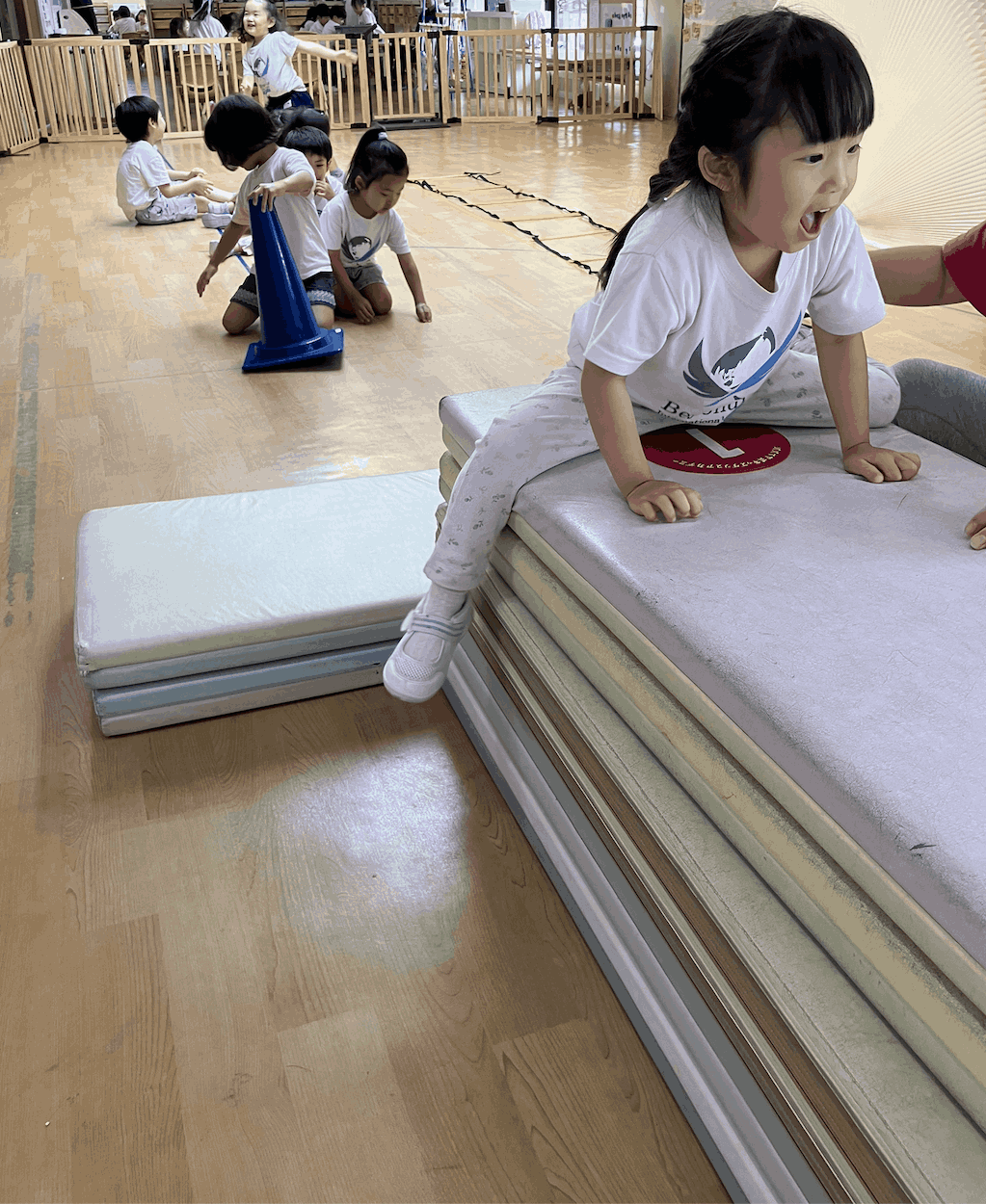 Our three-year-olds enjoy mat activities, stop-and-go games with rules, and hanging from the bar while supporting their bodies with their legs. Through playful running and jumping, they practice balance, arm strength, and rule-following, while also starting to build the confidence to take on challenges.