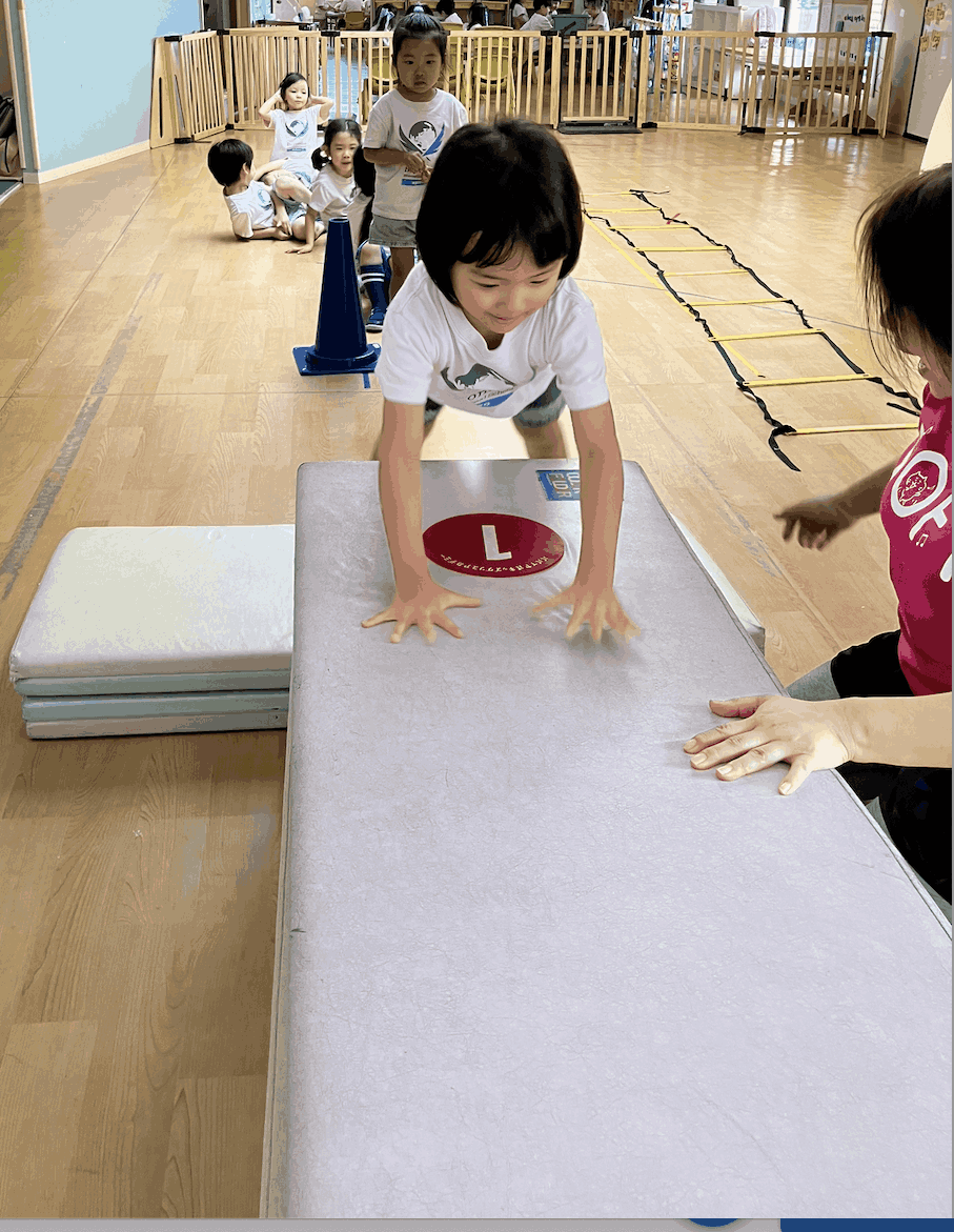 With activities like jumping over mats placed on the vaulting box and supporting their weight with both hands, children strengthen their core and body control. Relay races and tag relays also give them the chance to learn about teamwork, rules, and cooperation. Along the way, they develop quick reflexes, good judgment, and even empathy for their friends.