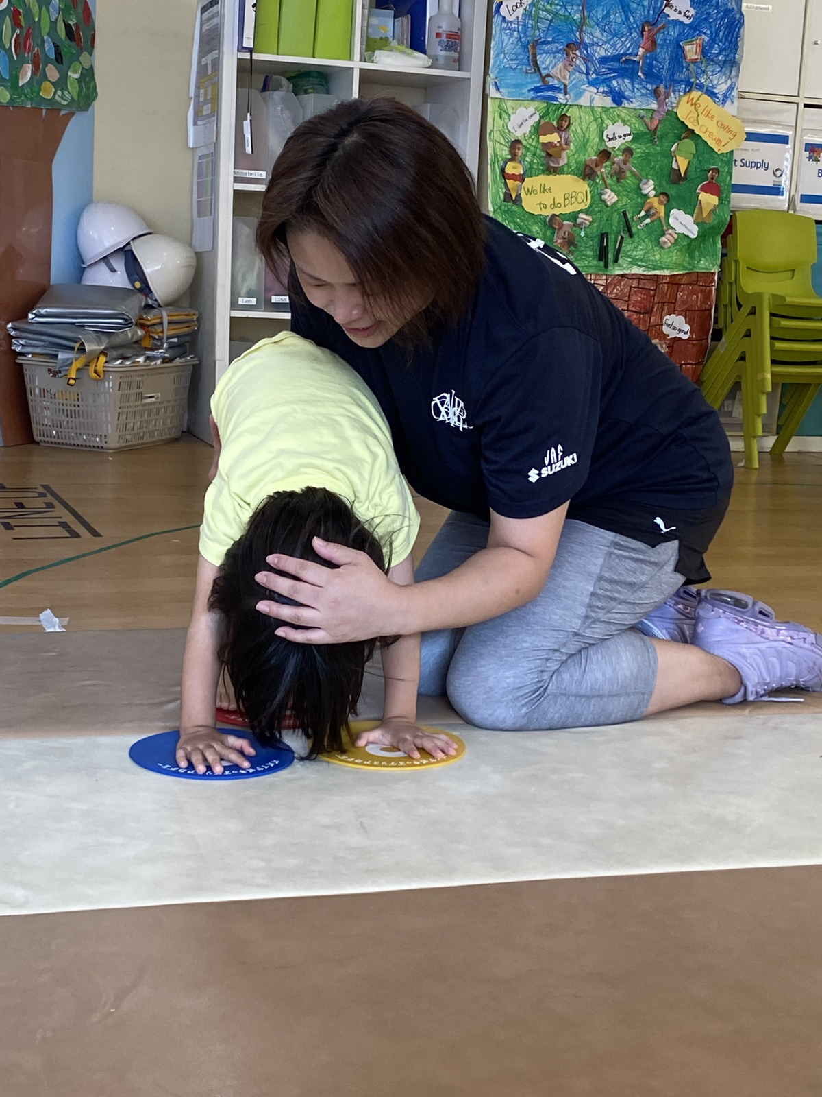 Our three-year-olds enjoy mat activities, stop-and-go games with rules, and hanging from the bar while supporting their bodies with their legs. Through playful running and jumping, they practice balance, arm strength, and rule-following, while also starting to build the confidence to take on challenges.