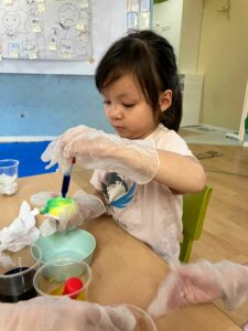 This day focused on the wonders of eggs. The children colored eggs to make bouncy balls and tried walking on eggs to test, “Can an egg really not break?” Eggs don’t break easily because their round shape distributes force. Surrounded by surprises and discoveries, the children nurtured their curiosity, observation skills, and interest in science by asking “Why?” and exploring answers.