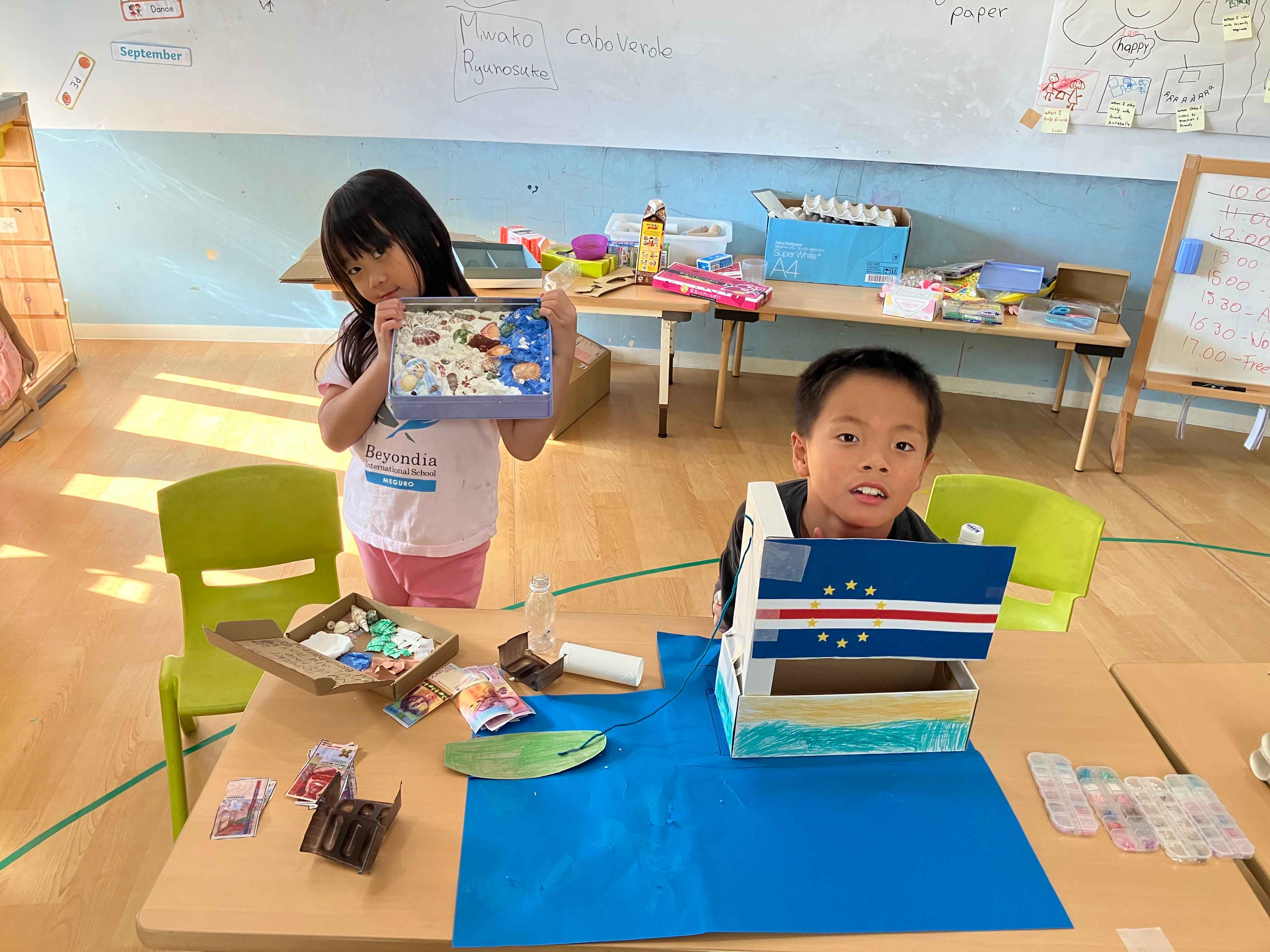 This day was themed “Summer Around the World,” exploring celebrations in Cabo Verde, Hawaii, and Canada. The children used recycled materials to express each country’s festivals and even organized their own mini-festival. They created play money, and friends from Afterschool and Preschool joined in, making it a lively summer day.