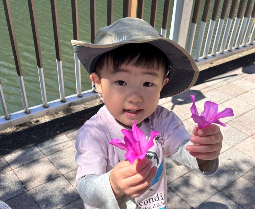 Surrounded by cherry blossoms in full bloom, the children paused to take in the scenery, watched petals drifting along the river, and showed a growing interest in the signs of spring.